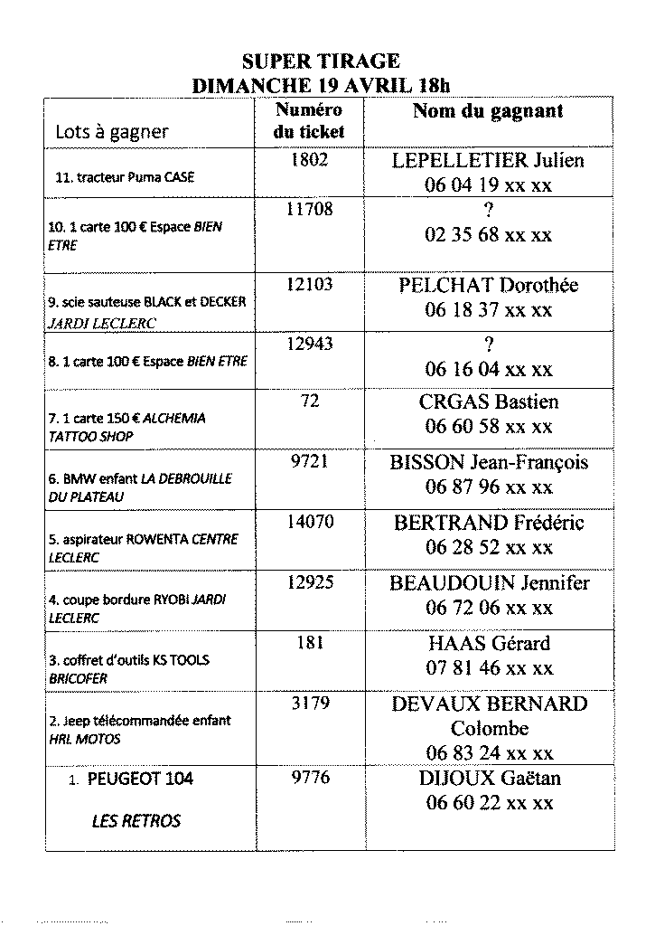 Voici la liste des gagnants des gros lots (ils seront appelés individuellement).